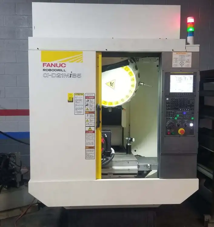 2021 FANUC ROBODRILL ALPHA D21MIB5 Vertical Machining Center for sale: 5-axis, 10,000 RPM, 34.8 HP, 19.68" X travel. Equipped with Haeberle 4th/5th axis table, Henning coolant tank, Renishaw probe, approx. 1675 cutting hours.