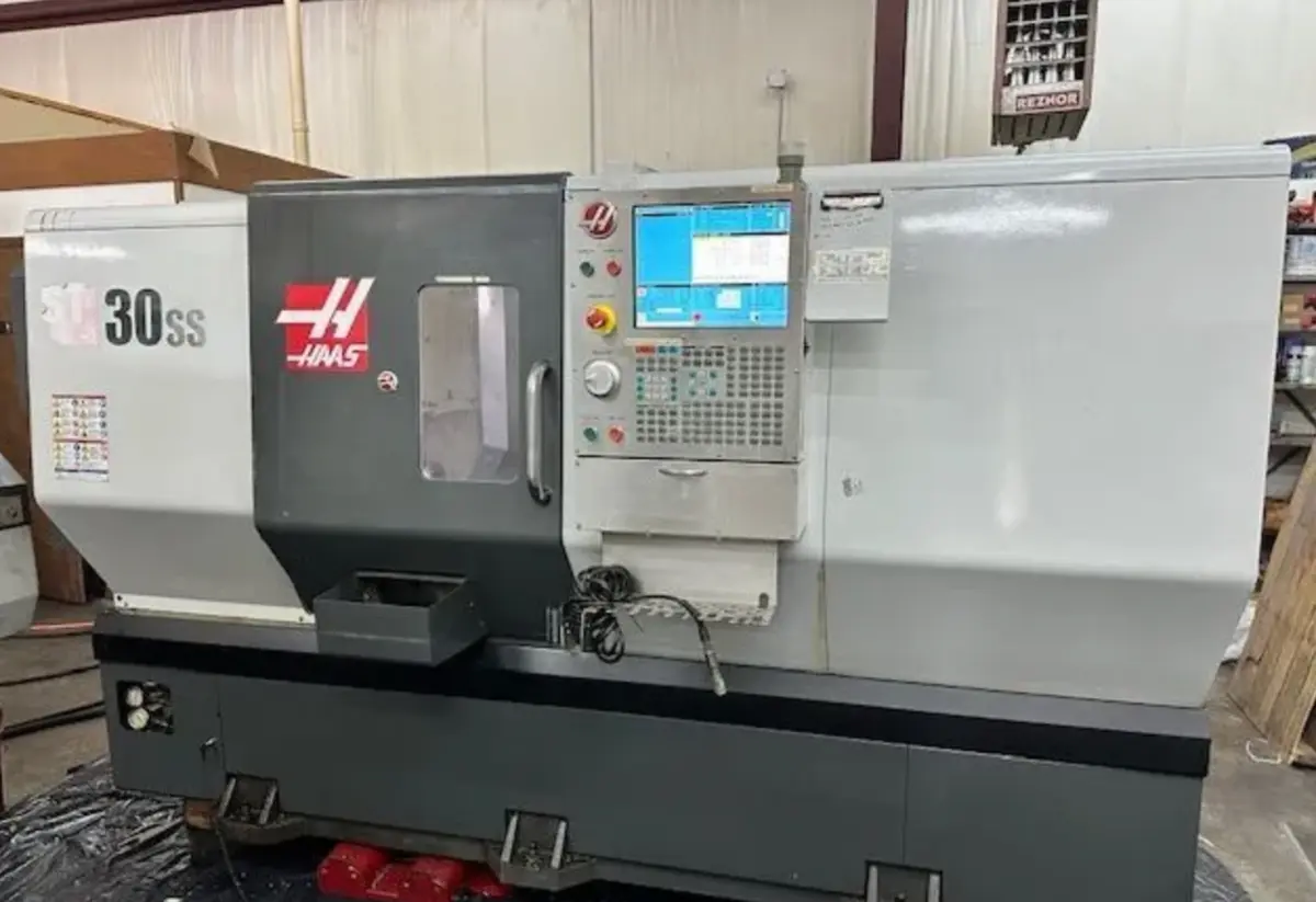 Used CNC Lathe featuring a 31.75" swing, 26" machining length, and 30 hp power. Equipped with HAAS CNC control, C-axis live tooling, hydraulic tailstock, and high-pressure coolant.