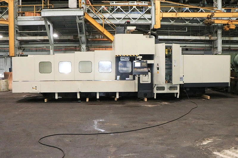 Gantry Machining Center. Used with 165"x63"x31.5" travel, 6,000 RPM spindle, 40 ATC, CAT 50 taper. Equipped with FANUC control, hydraulic counterbalance, spindle chiller, and coolant system.