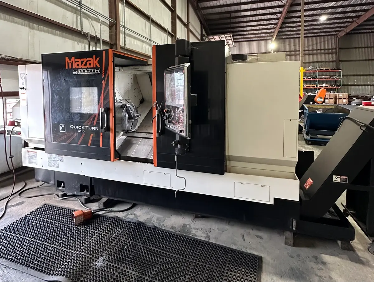 Used CNC lathe featuring 18" chuck size, 7.3" bar capacity, and max 2,000 RPM. Highlights include a 22.83" turning diameter, 24-station turret, Mazatrol Smooth control, tailstock, chip conveyor, and auto tool presetter.
