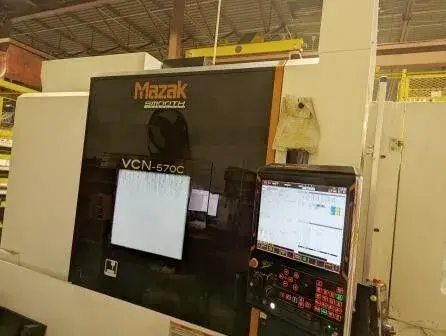 Vertical Machining Center, used. Specs: X 41.34", Y 22.44", Z 20.08", 15,000 RPM. Features: Mazatrol Smooth G control, 2-pallet changer, 30 ATC, CAT 40 spindle, chip conveyor, dual probing, 213 PSI coolant, air blast system.
