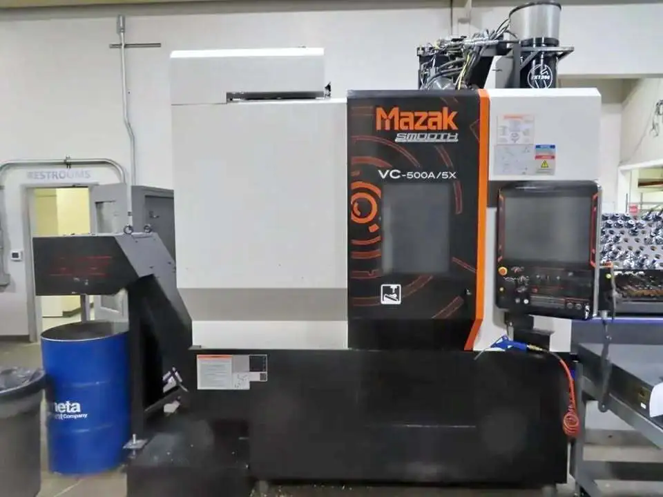 Used 5-axis vertical machining center, features a 19.88" x 19.88" x 20.07" travel, 15 hp, 15,000 RPM, Mazatrol SmoothX control, and Renishaw probing. Includes high-speed machining software and side exit chip conveyor.